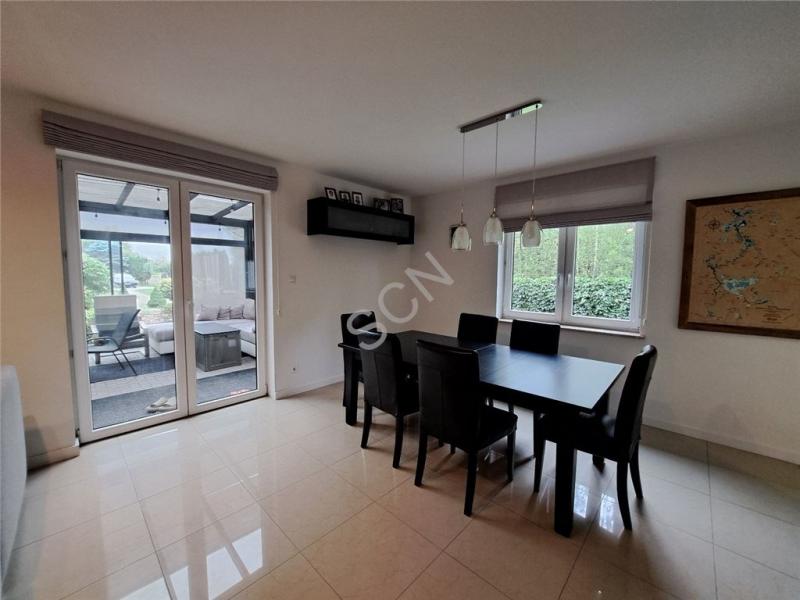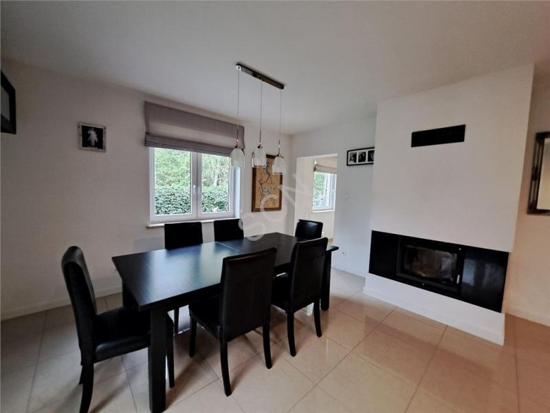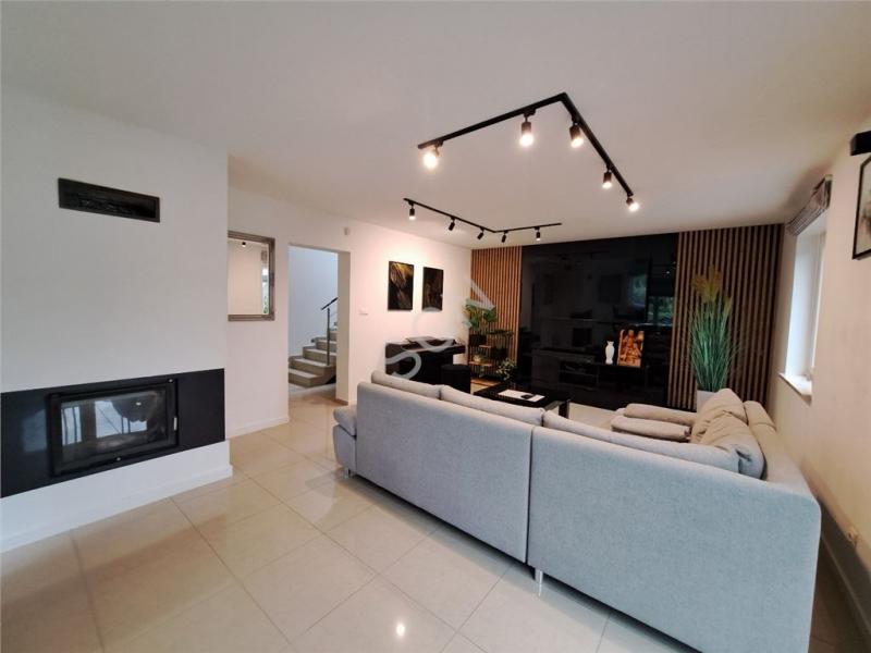 Parter : salon z kominkiem ,połączony z jadalnią i wyjściem na ogród zimowy .