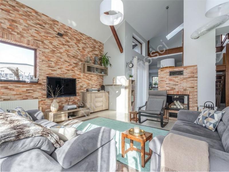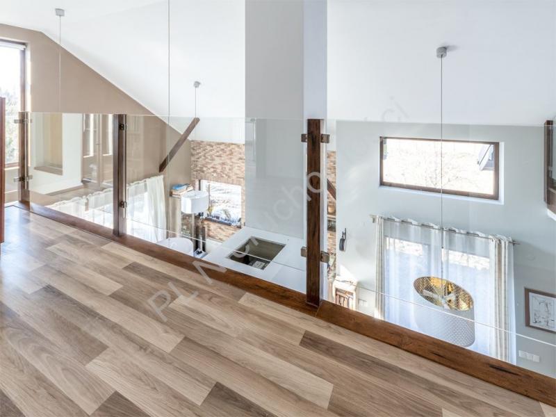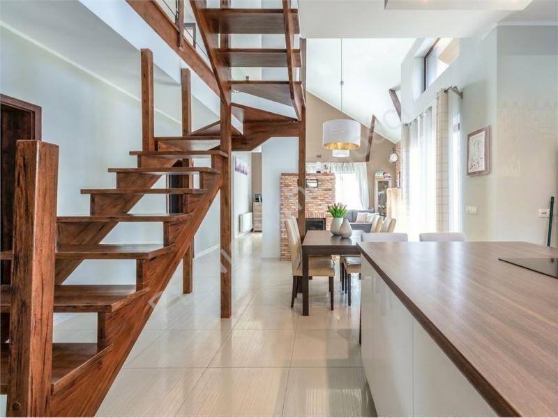 Sercem domu jest spektakularny salon o wysokości aż 6 metrów, który zachwyca przestrzenią i światłem. Duże przeszklenie na całą ścianę otwiera wnętrze na ogród, tworząc niezwykłe poczucie harmonii z naturą. Salon został wzbogacony o stylową antresolę oraz eleganckie, dębowe schody, które nadają wnętrzu wyjątkowego charakteru.