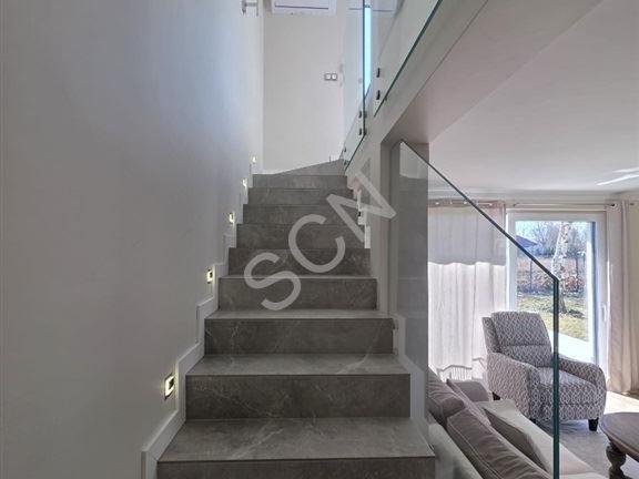 Dużym atutem domu są duże panoramiczne okna na dwóch poziomach, które doskonale doświetlają wnętrza i nadają przestrzeni nowoczesny charakter. Z salonu prowadzi wyjście na słoneczny taras oraz ogród, który stanowi idealne miejsce do wypoczynku i spędzania czasu na świeżym powietrzu.