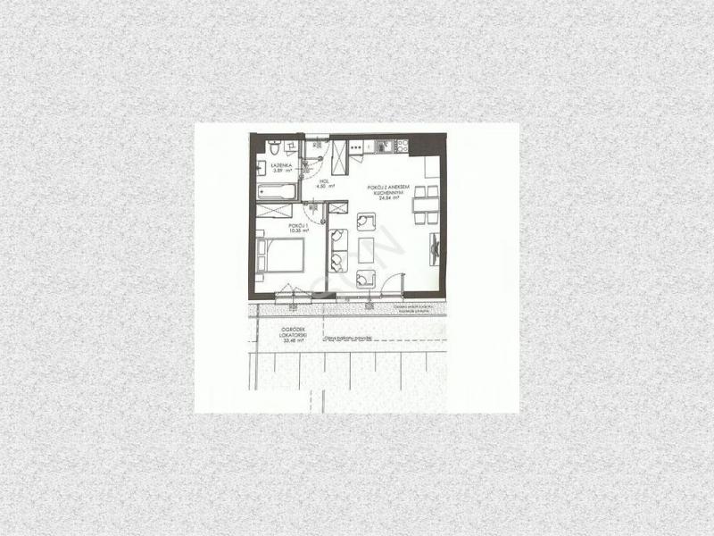 - pokój dzienny z aneksem kuchennym (24,54m), z wyjściem do ogródka i na taras (33,48m)