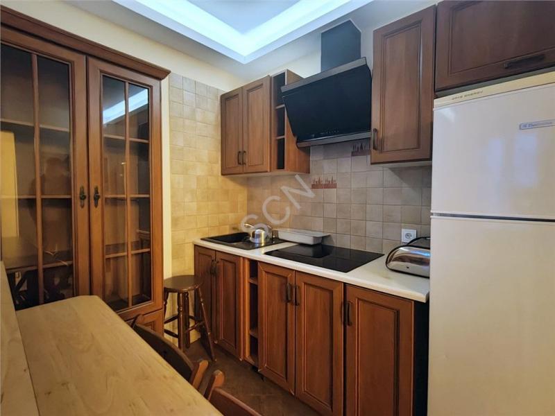Salon z aneksem kuchennym wyposażonym w kuchenkę indukcyjną, lodówkę i meble,